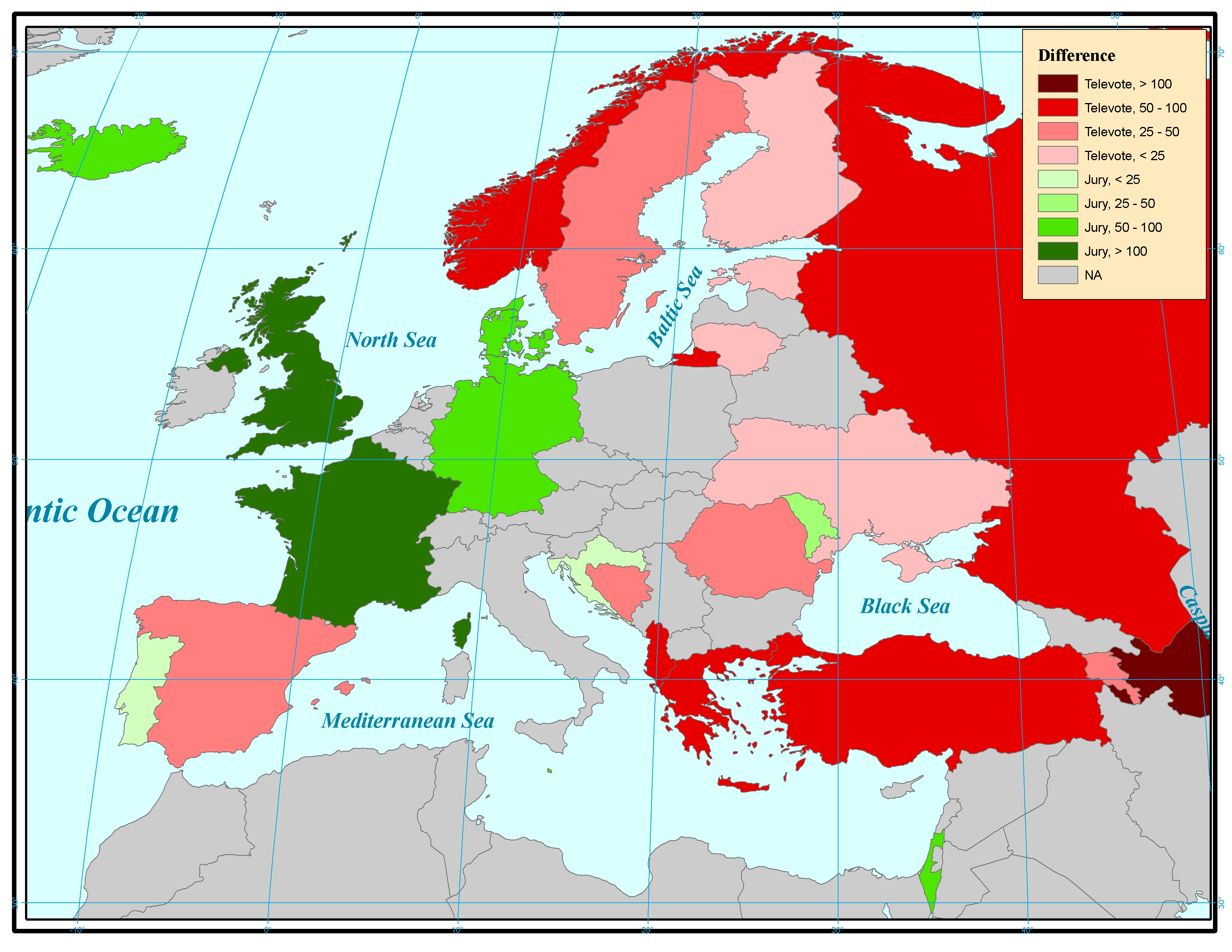While some Eastern European countries are obviously benefitting from televoting, the geographical divide between East and West in terms of jury votes and televotes was not as obvious as in the 2009 final.