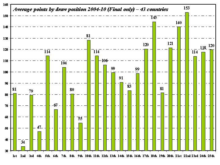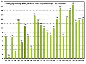 As the graph above shows (which works out the average number of points won by each draw position in Eurovision finals between 2004 and 2010), a late Eurovision draw position offers a competing country a distinct advantage. But there are subtle variants within different parts of the draw. In the earlier part of the draw entries drawn in the 5th, 7th, 8th and 1st draw positions have done significantly better than those drawn in the 2nd (the veritable draw of death), 4th, 9th and 6th positions. Similarly in the latter part of the draw, it is evident that a draw position near the end, but not at the end, is the most advantageous draw to get. It is better to be on three songs before the end than in the very last draw position – a notable difference from the trend for semi-finals in which the last draw position proved to be the most advantageous (possibly due to the generally smaller number of countries in a semi-final – the 2007 marathon semi final being a notable exception). Based solely on draw position we would be off to Madrid for the 2012 contest – the 2011 results would read as follows: 1. Spain 153, 2. Austria 145, 3. Iceland 140, 4. Russia 128, 5. Slovenia 121, 6j. Romania and Georgia 120, 8. Serbia 118, 9j. France, Hungary and Ukraine 114, 12. Italy 106, 13. Sweden 104, 14j. Switzerland and Germany 99, 16. UK 91, 17. Moldova 83, 18 j. Azerbaijan and Finland 81, 20. Estonia 80, 21. Denmark 79, 22. Ireland 67, 23. Greece 55, 24. Lithuania 47, 25. Bosnia and Herzegovina 34. It is notable that in the bulk of cases draw positions are not conveying an unsurpassable advtantage, with not much more than 40 points separating the countries ranked between 4th and 20th place, although the significant advantage of a later draw and disadvantage of an earlier draw (especially draw position No. 2) become readily apparent here.