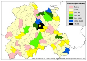 The provisional Census 2011 figures published today offer some interesting insights in terms of demographic change in Ireland over the last five years. Despite speculation that population growth levels may have slowed during the Celtic Tiger era, the percentage level of population growth nationally proved to be similar to that for the 2006 Census (although this of course was covering a much shorter time period due to the postponing of the 2001 Census until 2002). As always, there is a very definite geography to population change and population growth levels have been especially concentrated on the counties in the Dublin commuter belt, and the county to especially stand out in this regard, having experienced the greatest percentage increase in population since 2006, is Laois (more…)