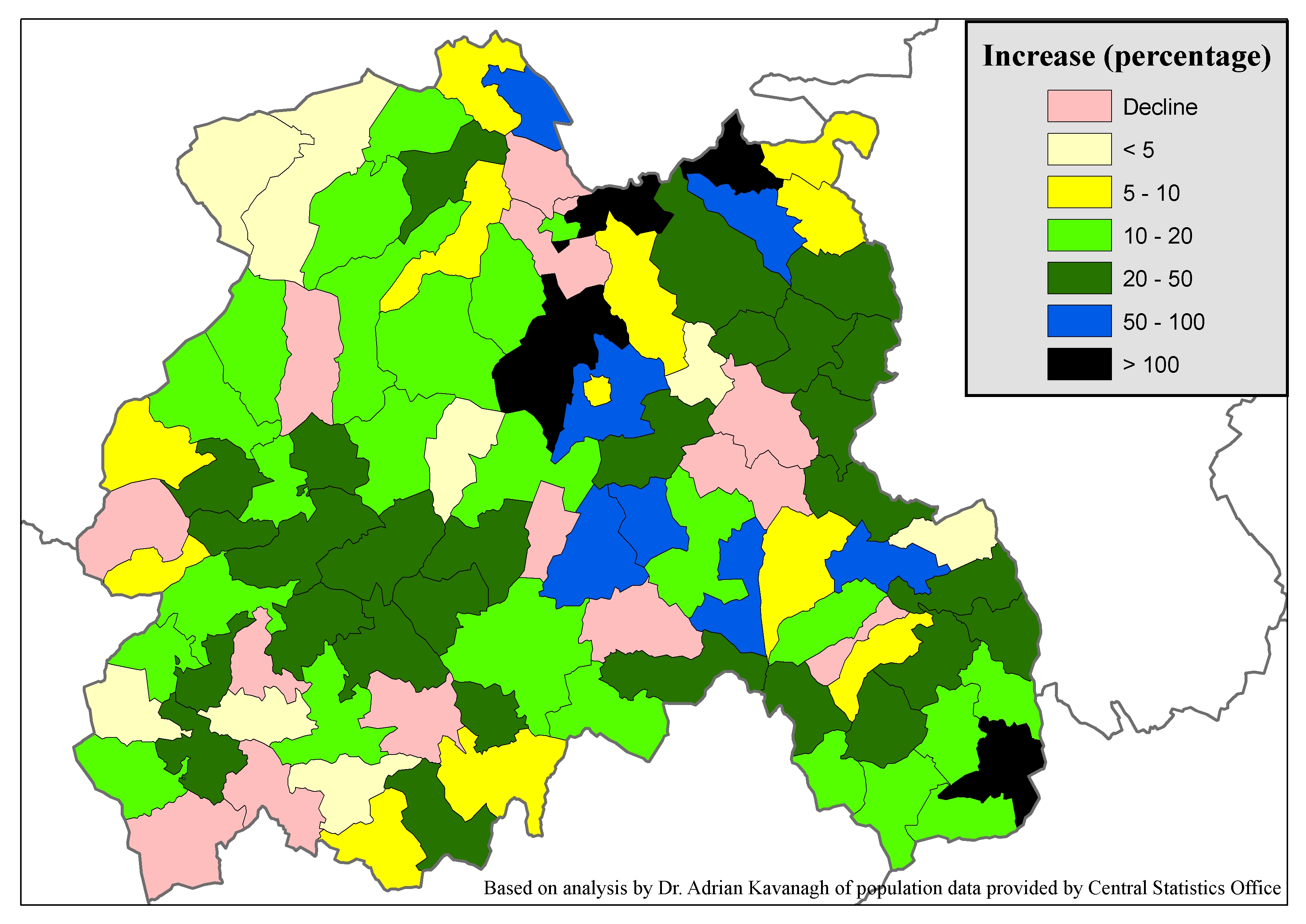 Mapping the percentage population growth figures allows one to look beyond the larger/more densely populated electoral divisions and see the general geography of population increase in the county. These again reflect the general trends noted when studying the raw population change numbers; of especially high growth levels in the eastern parts of the county (areas located within the Dublin commuter belt) and especially in, and around, the larger towns in this area. Looking outside these areas, the impact of commuting can be further evidenced by a strong concentration of population growth around the M7 corridor, as well as a more localised spike in population growth levels around Ballybrophy rail station in the south-west of the county. Not every area has experienced population growth however. Population has declined in the some of the electoral divisions located in the west of the county, for instance.