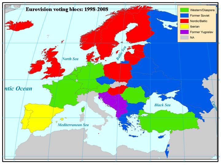 Eurovision televoting blocs: during the 2000s most of Ireland’s Eurovision points have tended to come from the Nordic bloc (shaded in red)