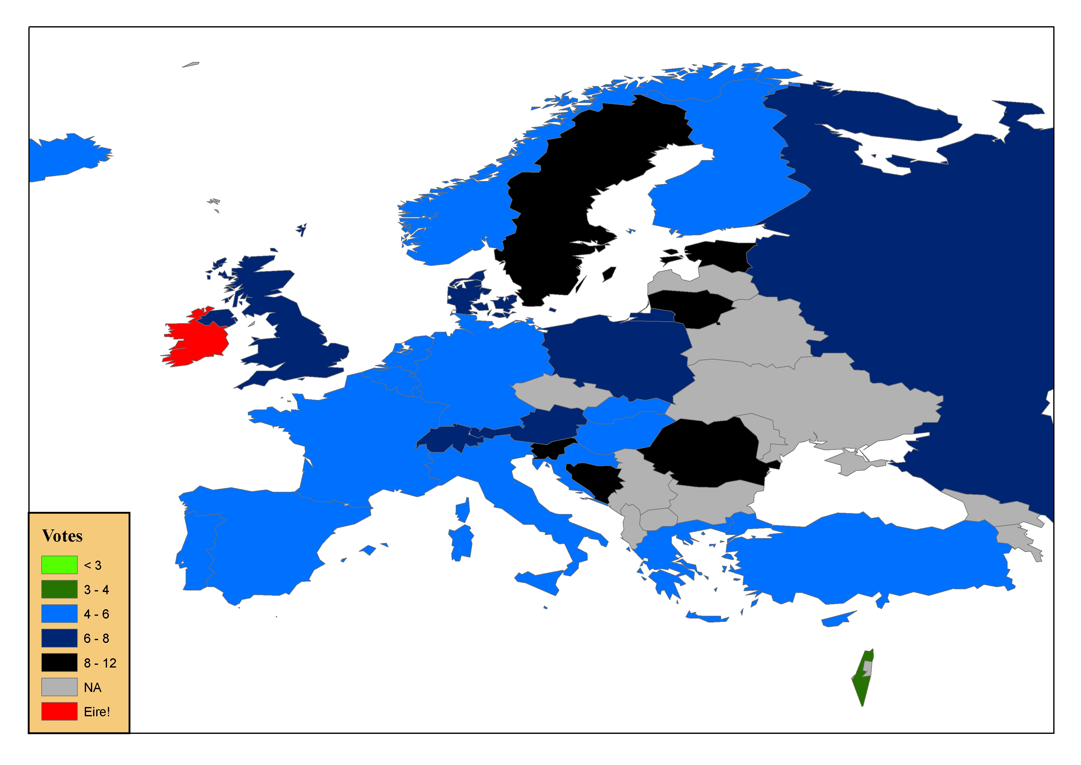 Average votes won by Irish entries at Eurovisions between 1998 and 2006. Much of the continent effectively was a Eurovision desert, with few, or no, points are being won from many of these countries.