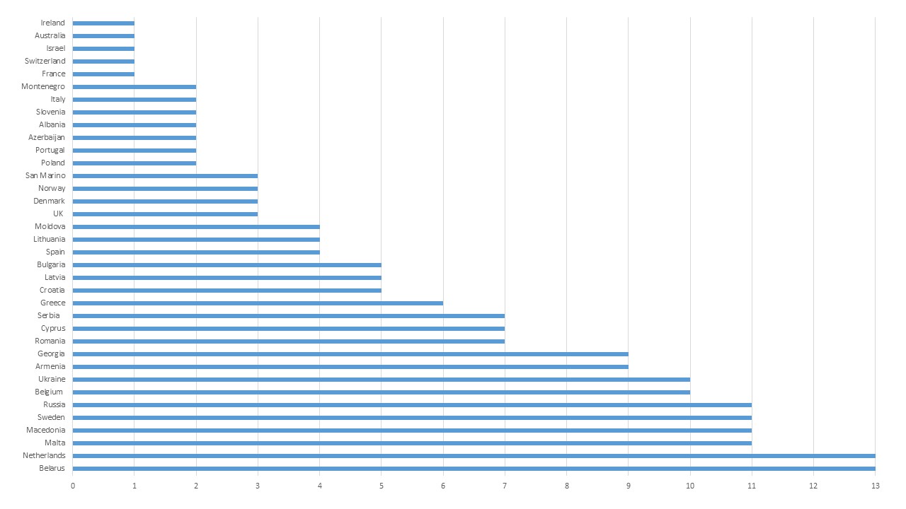 Figure 1: Number of participations at the Junior Eurovision Song Contest by state between 2003 and 2015