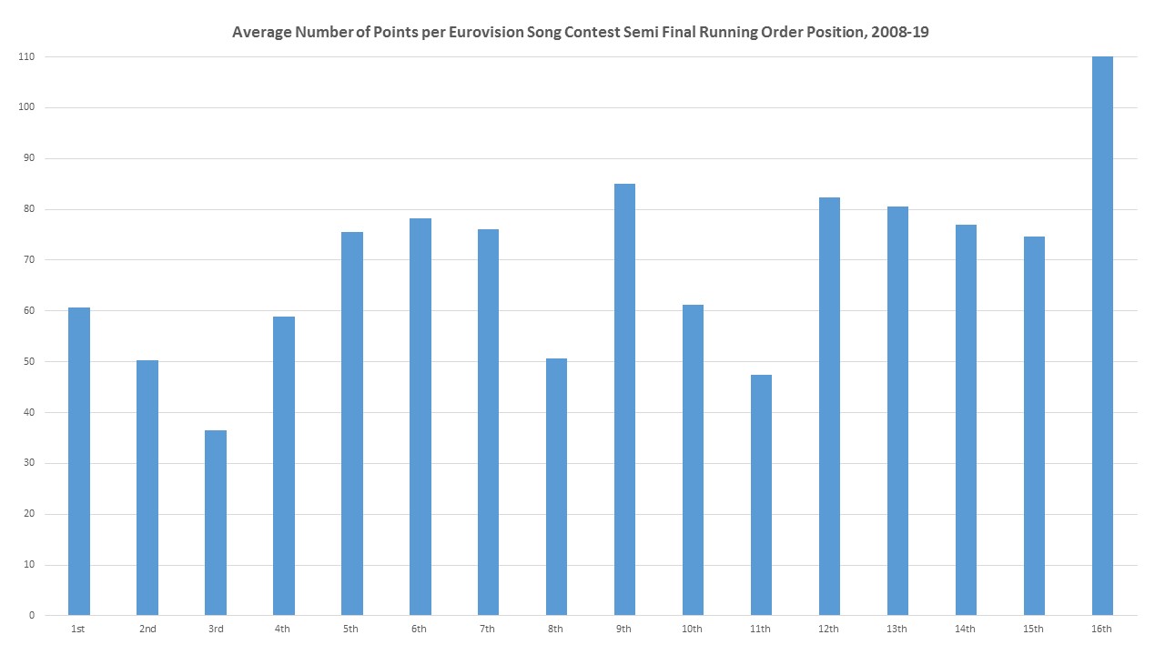 Who are the big winners here in terms of the semi final running order allocations? The best position to attain, as evidenced on the data presented in Figure 3, is the last position in the running order. This obviously helps Malta in Semi Final 1, although as (currently) the favourites to win Eurovision, it could be argued that Malta does not need the boost of the prime slot in the running order. But this running order allocation does definitely help Denmark in Semi Final 2 – before the running order, Denmark would have appeared to be outsiders to qualify from this semi final, but attaining the prime slot in this semi final’s running order does push Denmark back into contention to make it out of this semi final.