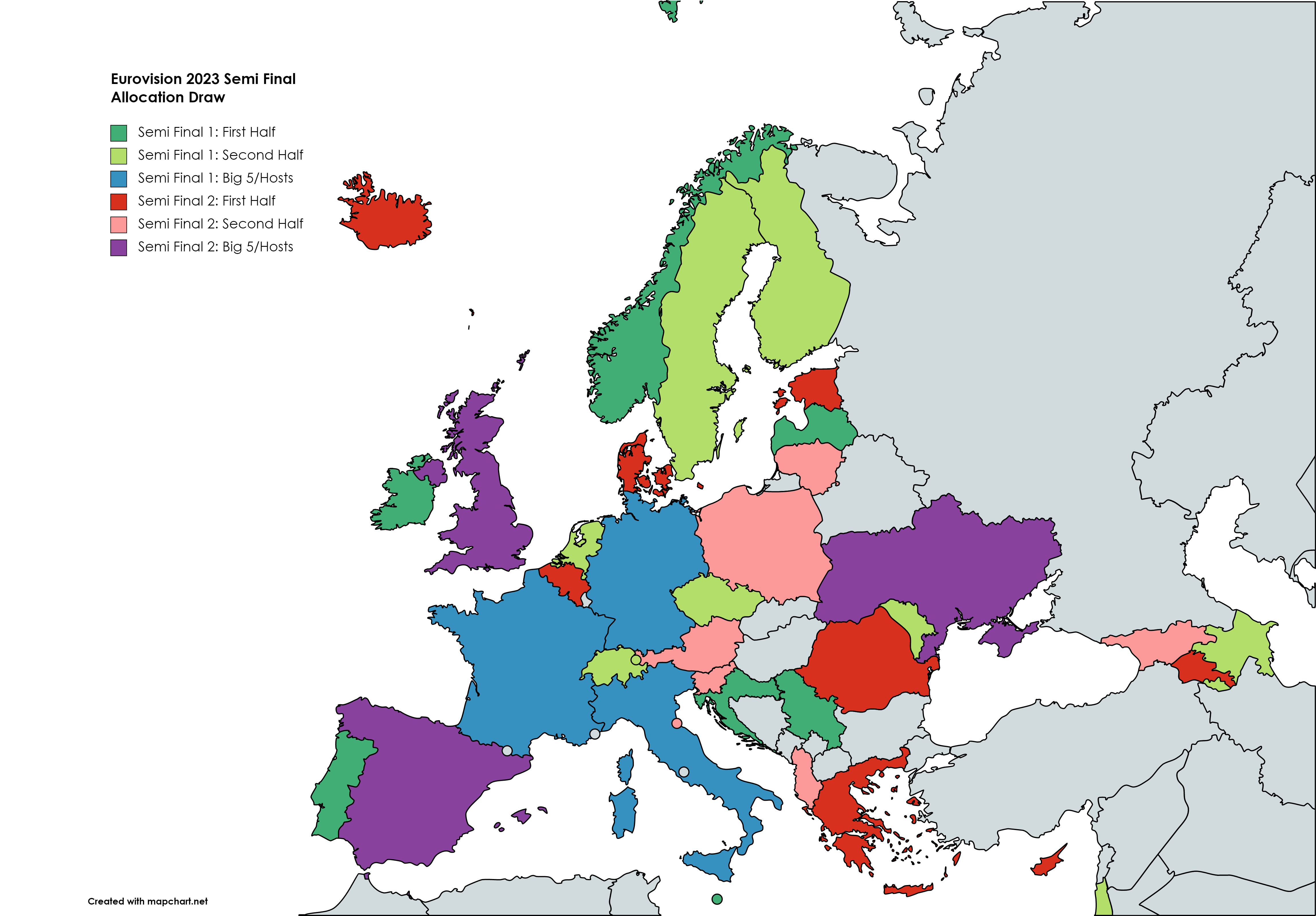 Tonight the semi-final allocation draw for the 2023 Eurovision Song Contest will take place in Liverpool. This will tell us what countries (out of the 31 countries that do not qualify directly for the Final) will take part in Semi Final 1 (on Tuesday 9 May) or Semi Final 2 (on Thursday 11 May), which semi-final will be allocated to the “Big 5″/Host countries (Ukraine, United Kingdom, Spain, Germany, Italy and France) to vote in, and whether a country gets to vote in the first half or second half of the semi-final that they have been drawn into.
